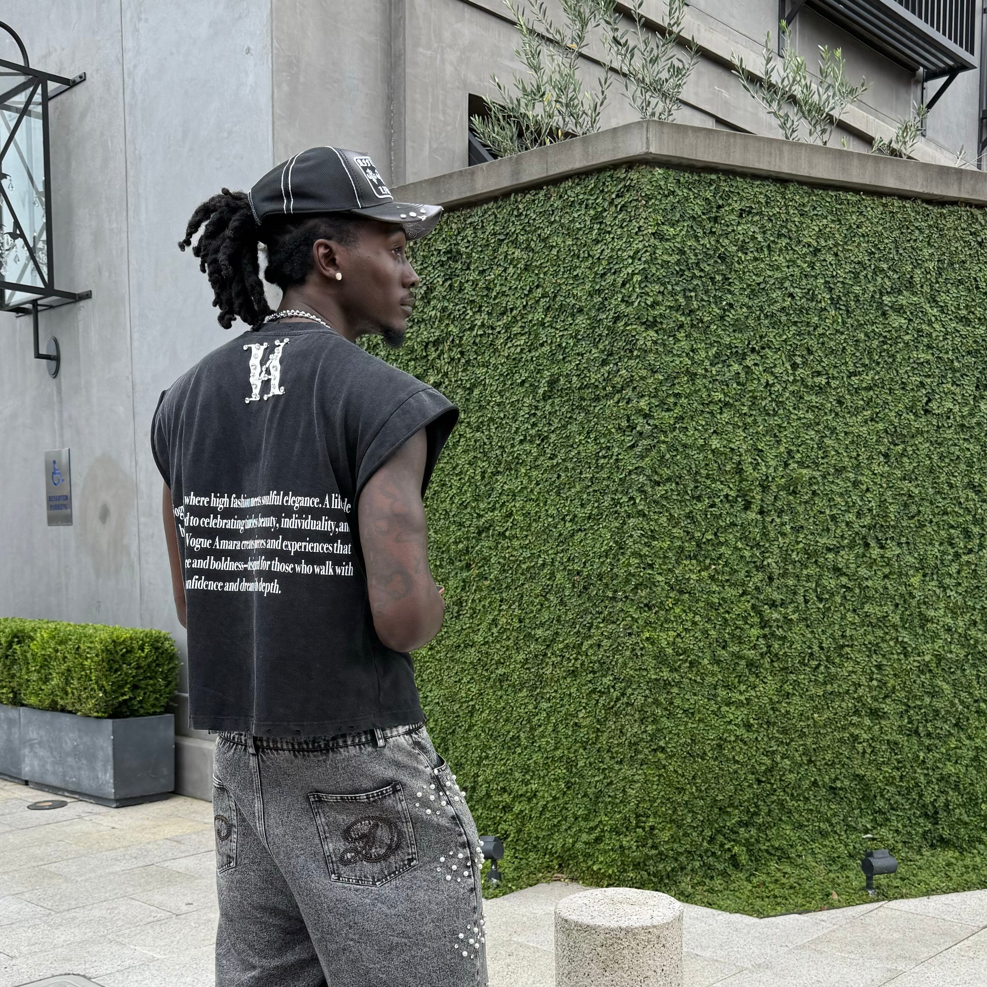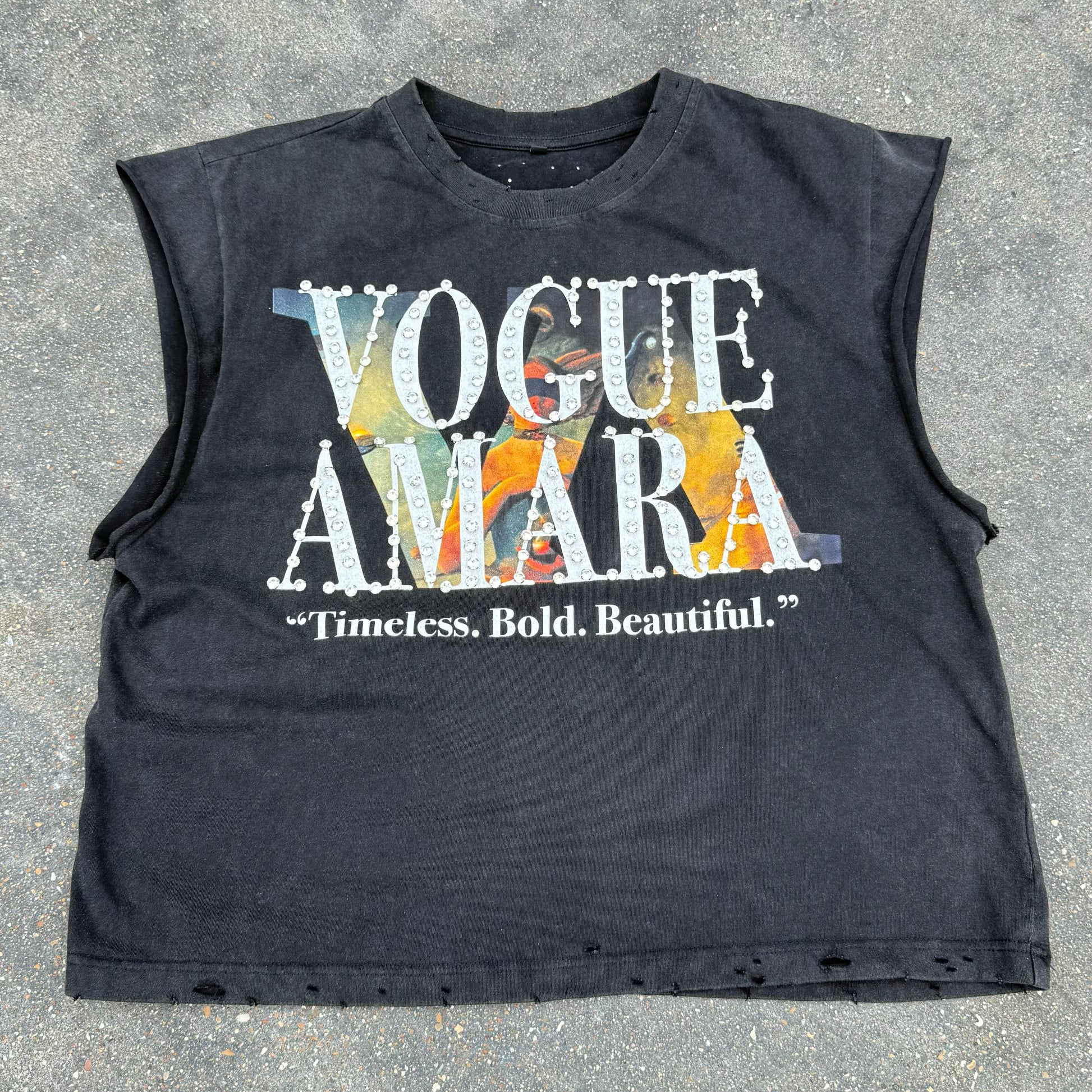 Make a statement in our signature sleeveless tee, featuring the iconic VOGUE AMARA logo with nail-pressed rhinestones for a luxury edge. Designed with premium 100% cotton, a DTG-printed multi-color graphic, and distressed detailing for that high-fashion, street-ready vibe. Oversized, relaxed fit for ultimate comfort and style.
